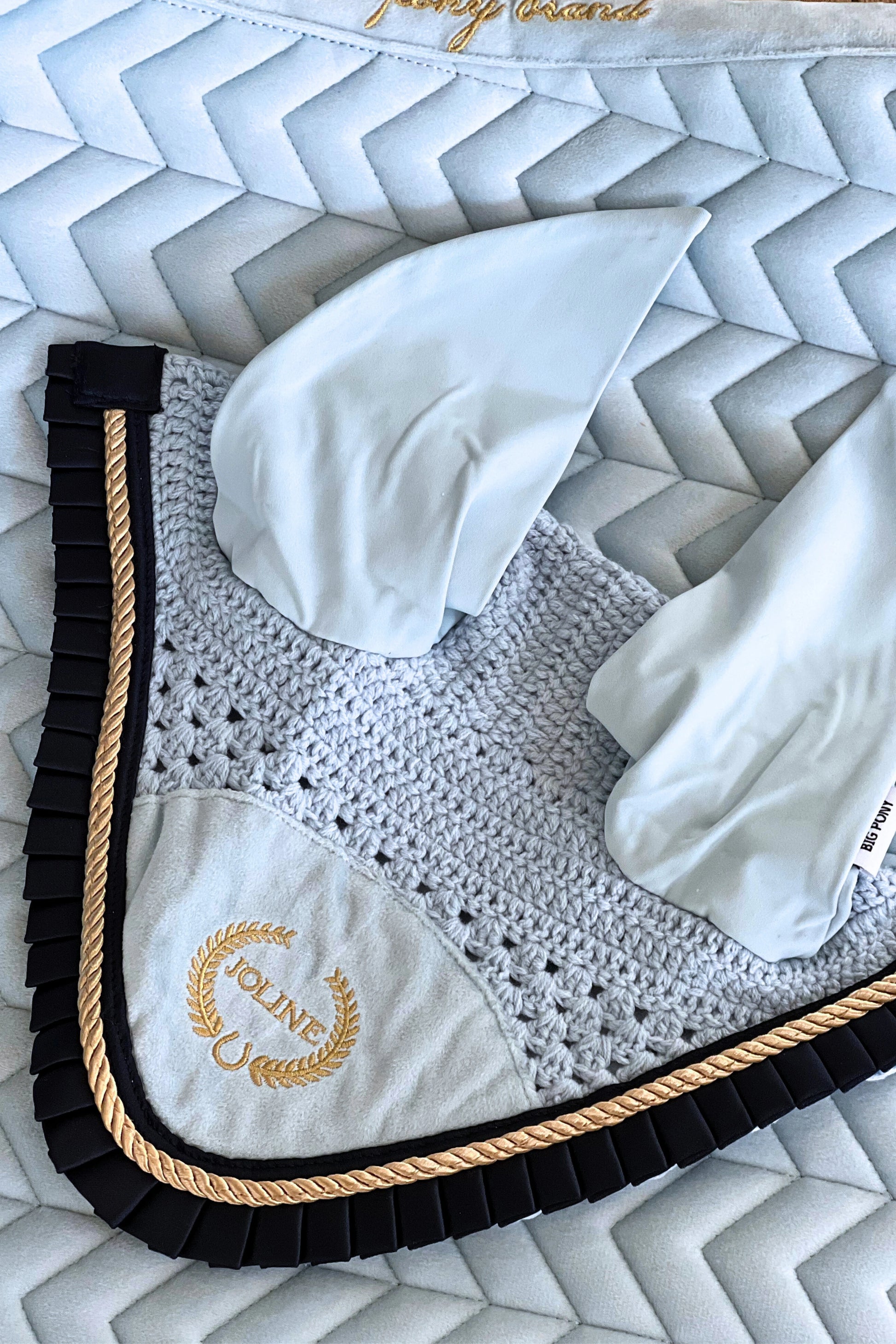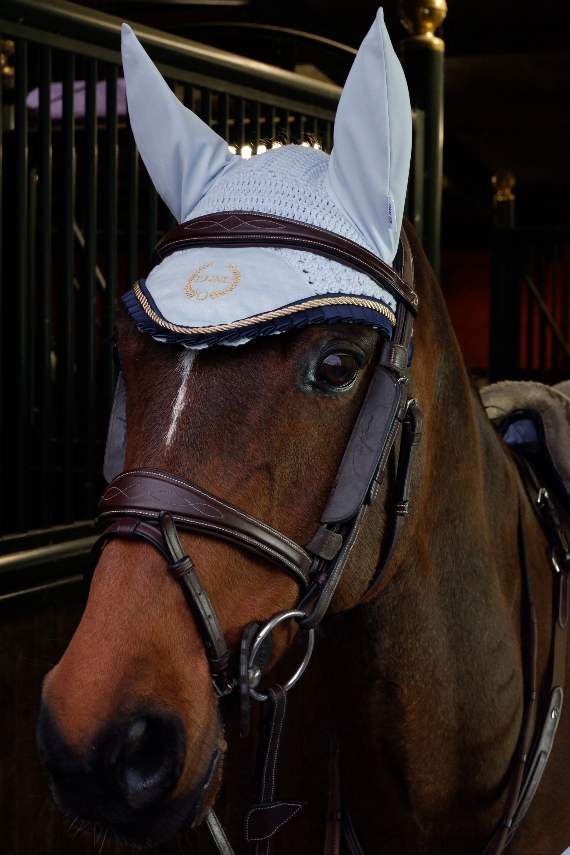 Het oornetje aquablauw is een elegante en praktische keuze voor elke pony of paard. Dit oornetje is voorzien van een witte ruffle bies, afgewerkt met een gouden koord voor een luxe uitstraling. De elastische oren zijn gemaakt van een rekbaar, ademend, antimicrobieel en sneldrogend materiaal.